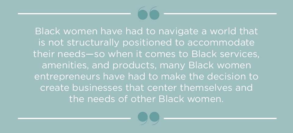 white-serving and led businesses do not. Black women have had to navigate a world that is not structurally positioned to accommodate their needs—so when it comes to Black services, amenities, and products, many Black women entrepreneurs have had to make the decision to create businesses that center themselves and the needs of other Black women.