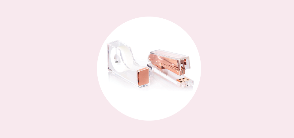 - This Rose Gold Stapler + Tape Dispenser: They're a beautiful enough duo that you are convinced you need a stapler and a tape dispenser—or is that just us?