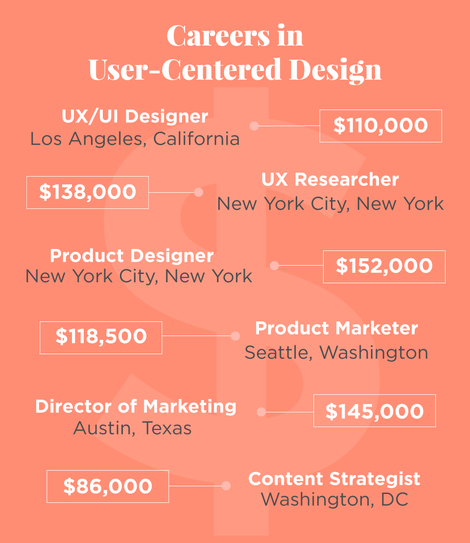 Since user-centered design involves a comprehensive combination of both hard skills and soft skills, this particular competency opens a variety of options for a career. For example, one can take UX/UI design skills directly into a UX/UI Design job role—or you can use the strong skill sets you’ve developed to your advantage in a marketing or strategy role. Here are some roles that require user-centered design—plus